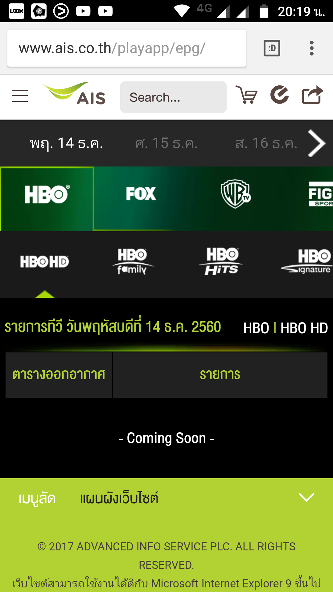 ลองมาเช็คผังรายการที่เว็บAis กดไปช่องไหนก็เจอแต่คำว่า "coming soon"