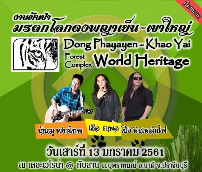 สมาคมอุทยานแห่งชาติและสมาคมอนุรักษ์ป่ามรดกโลกดงพญาเย็น-เขาใหญ่ ซึ่งเป็นสมาคมที่จัดตั้งขึ้นมาจากการรวมตัวของภาคประชาชนและภาคเอกชน ที่มีประสบการณ์และมีความทุ่มเทกับการรักษาผืนป่าและสัตว์ป่าของไทย รวมถึงแหล่งมรดกโลกทางธรรมชาติของไทย โดยเฉพาะอย่างยิ่ง กลุ่มป่ามรดกโลกดงพญาเย็น-เขาใหญ่ซึ่งได้รับการขึ้นทะเบียนจาก UNESCO ได้ร่วมกันจัด “งานผืนป่ามรดกโลกดงพญาเย็น-เขาใหญ่” ในวันเสาร์ที่ 13 มกราคม 2561