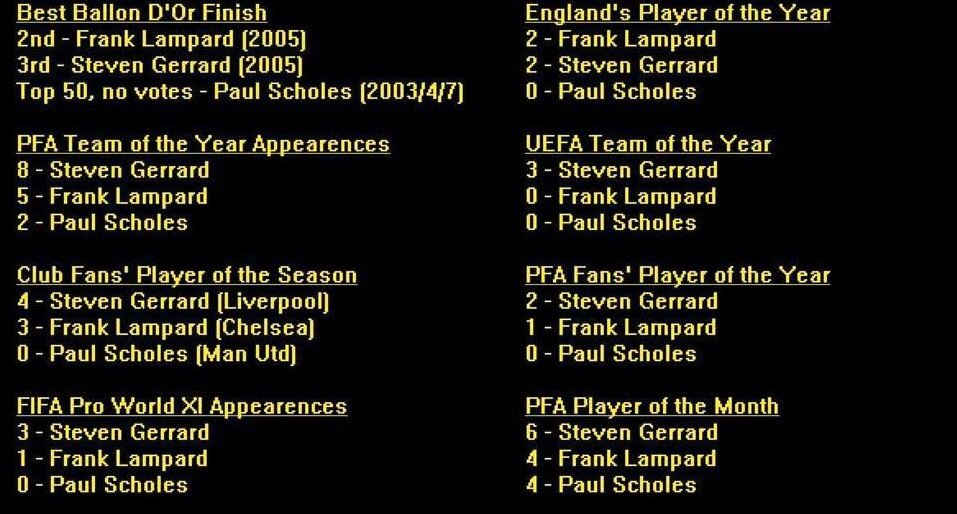 ก่อนหน้านี้ โทนี่ โครส มิดฟิลด์ทีมชาติเยอรมนีของ เรอัล มาดริด จุดประเด็นด้วยการยกให้ สโคลส์ เหนือกว่า เจอร์ราร์ด กับ แลมพาร์ด และล่าสุด ซาฮา กับ ลอฟตัส-ชีค ถูกยิงคำถามเดียวกันจากผู้ชมบ้างในการให้สัมภาษณ์กับสกาย สปอร์ตส์