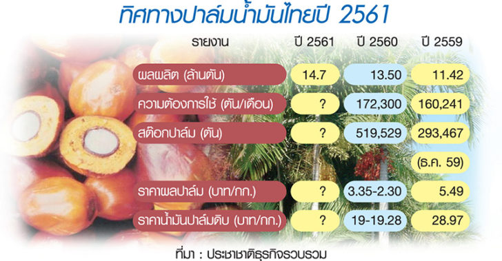 ในปี 2561 ผลผลิตปาล์มน้ำมันจะมีปริมาณ 14.7 ล้านตัน เพิ่มขึ้น 9.0% จากปี 2560 เนื่องจากผลผลิตเพิ่มขึ้นในทุกภาค จากต้นปาล์มน้ำมันที่ปลูกใหม่เมื่อปี 2558 ที่เริ่มให้ผลในปีนี้ ประกอบกับปริมาณน้ำฝนมาก จึงอาจส่งผลให้จำนวนทะลายปาล์มเพิ่มขึ้น ประเด็นนี้หน่วยงานที่เกี่ยวข้องยังคงเตรียมมาตรการแก้ไขปัญหาปาล์มที่อาจจะซ้ำรอยในปีนี้อีกครั้ง