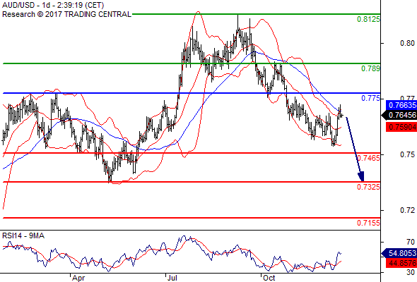 ความเห็นในเชิงเทคนิค: หากแนวต้านที่ 0.7750 ยังไม่เลยขึ้นไป ความเสี่ยงที่จะทะลุต่ำกว่า 0.7465 ยังคงสูงอยู่
