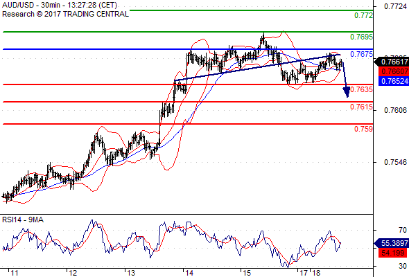จุดที่ต้องการ: สถานะขายต่ำกว่า 0.7675 เป้าหมายต่อไปที่ 0.7635 และ 0.7615