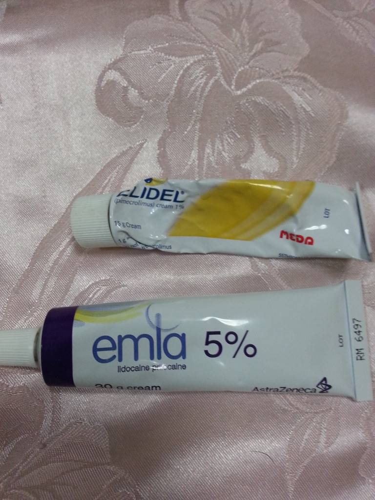ตัวล่างเป็นครีมยาชาครับ ใช้ทาคอมโบกับ elidel เพราะ ตัวบนแก้ผื่น แต่ทาแล้วคัน