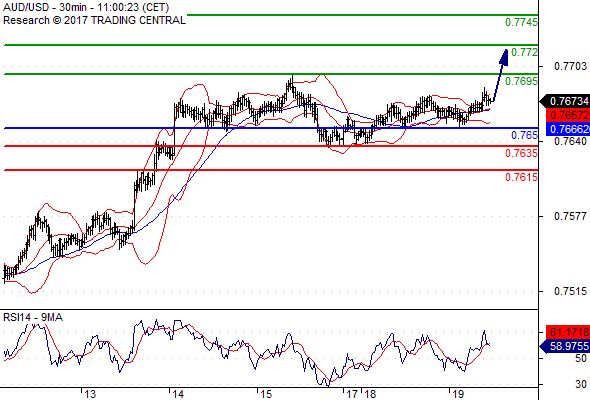 จุดที่ต้องการ: สถานะซื้อสูงกว่า 0.7650 เป้าหมายต่อไปที่ 0.7695 และ 0.7720