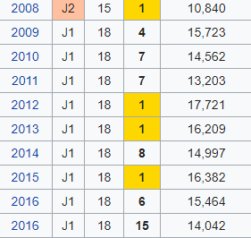 ดูตามสถิติจะเห็นได้ว่าเกือบ 10 ปีที่ผ่านมาได้แชมป์เจลีกไปถึง 3 สมัยและอยู่หัวตารางมาโดยตลอด