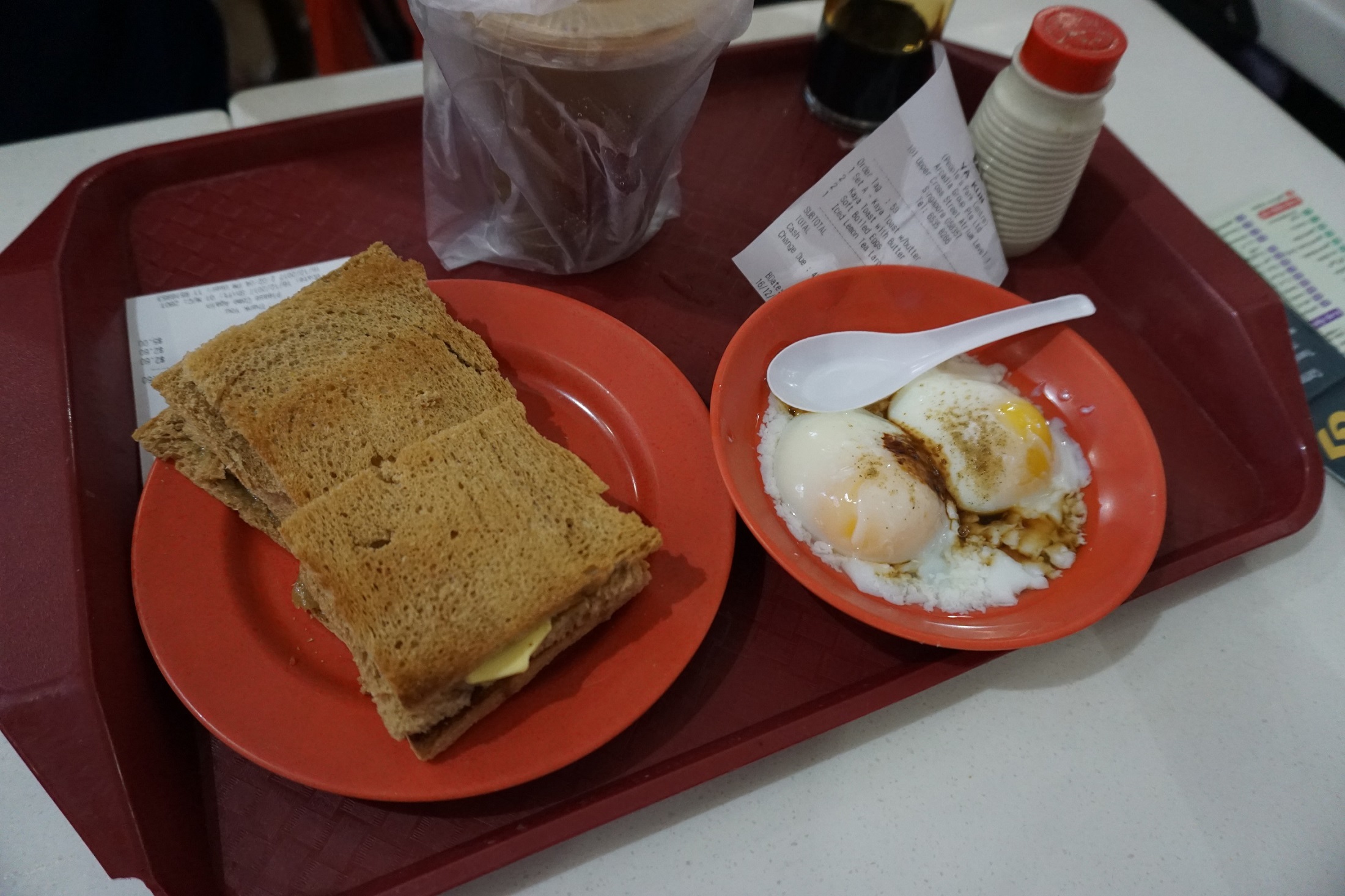11. ไปลองชิม Yakun Kaya Toast (People's Park Centre) ครั้งแรกขอเปลี่ยนกาแฟเป็นน้ำมะนาว เพิ่มเงินเป็น $6.50 จากเดิมชุดนี้ ราคา $4.80 แต่น้ำมะนาวรสชาติไม่ไหวจริงๆ จางมากๆ สามีเลยไปสั่งกาแฟเย็นมา $1.60 รสเข้มข้นสะใจ ตื่นเลยค่ะ ขนมปังปิ้งอร่อย ไข่ลวกปกติค่ะ
