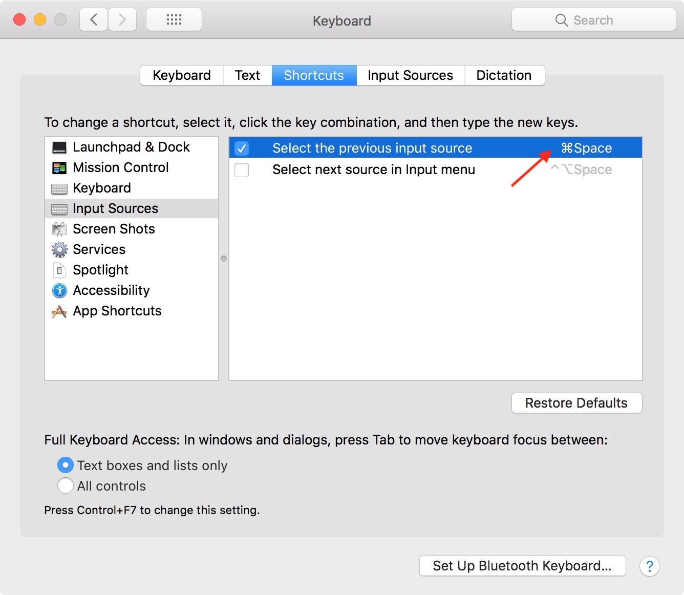เปลี่ยนคีย์ลัด เข้าไปที่รูป แอปเปิ้ลซ้ายบนสุด เลือก System preference > Keyboard > Shortcuts > Input Source แล้วกดคลิ๊กตรงตัวคำสั่ง (ตรงลูกศรแดง) ลบของเก่า แล้วใส่คีย์ลัดใหม่ที่ต้องการได้เลย