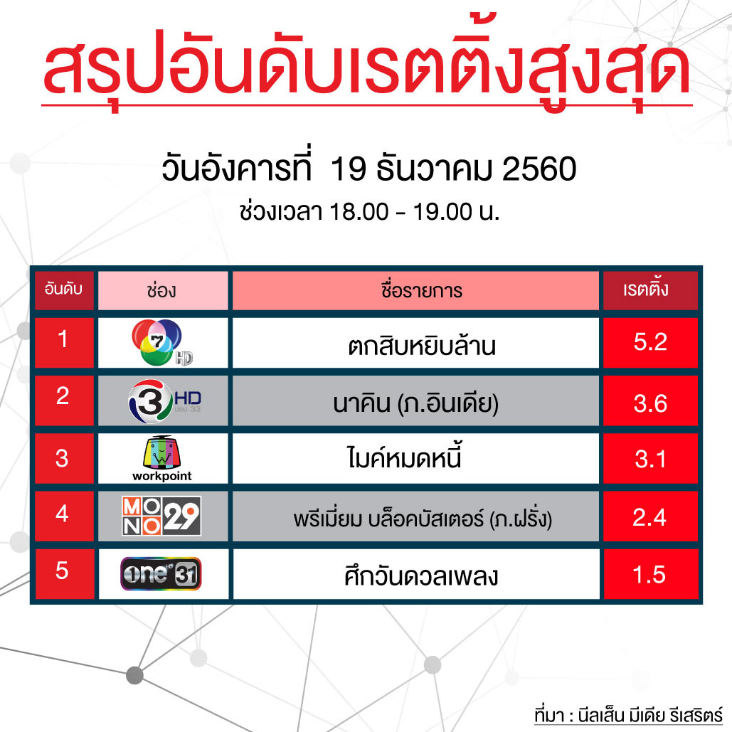 สรุปเรตติ้งสูงสุดประจำวันอังคารที่ 19 ธ.ค. 60 ช่วงเวลา 18.00 - 19.00 น.