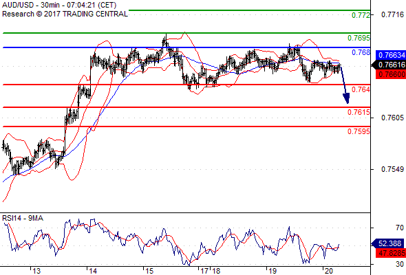 จุดที่ต้องการ: สถานะขายต่ำกว่า 0.7680 เป้าหมายต่อไปที่ 0.7640 และ 0.7615