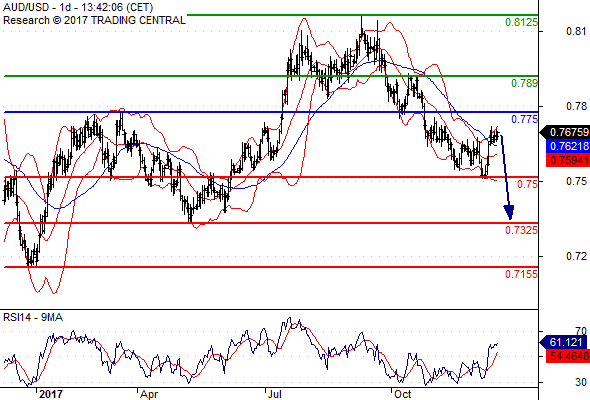 ความเห็นในเชิงเทคนิค: หากแนวต้านที่ 0.7750 ยังไม่เลยขึ้นไป ความเสี่ยงที่จะทะลุต่ำกว่า 0.7500 ยังคงสูงอยู่