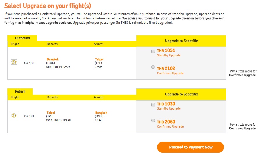 จริงๆจะซื้อน้ำหนักกระเป๋าเพิ่มตอนขากลับอย่างเดียว เฃ็คราคาก่อนหน้าประมาณ 1 พันนิดๆ แล้วเพิ่งได้รับเมล์เกี่ยวกับส่วนลดการอัพเกรดเป็น SCOOTBIZ แต่พออ่านรายละเอียดแล้วไม่ค่อยแน่ใจ เพราะเห็นมี 2 ราคา ตั้งใจจะเลือกขากลับที่ราคา 1,030 เลยงงว่ามันต่างกันตรงไหนบ้าง และอันที่จะเลือกนี้ได้อะไรบ้าง เพราะจากที่เข้าไปอ่านหน้าเว็บมันไม่ได้แยกมาให้ว่าเป็นของ Standby Upgrade หรือว่า Confirmed Upgrade หรือตัวเองอ่านแล้วไม่เข้าใจก็ไม่รู้ เลยอยากรบกวนช่วยแนะนำหน่อยคะ ว่าถ้าเลือก Standby Upgrade คือเป็นชั้นธุรกิจได้โหลดกระเป๋า 30 โล ได้เลือกที่นั่งและอาหารด้วยใช่รึเปล่า จริงๆไม่ได้ซีเรียสเรื่องที่นั่งและอาหาร เพราะแค่ต้องการจะซื้อน้ำหนักกระเป๋าเพิ่มขากลับ แต่ว่าถ้าอัพเกรดแล้วได้ตามนี้ก็ดี เพราะราคาใกล้เคียงกัน แต่ไม่แน่ใจเกี่ยวกับรายละเอียดตามหน้าเว็บเลยอยากรบกวนขอความช่วยเหลือหน่อยค่ะ ปกติก็เคยนั่ง Nok แต่ NokScoot เพิ่งจะเคยจอง รายละเอียดตามด้านล่างค่ะ