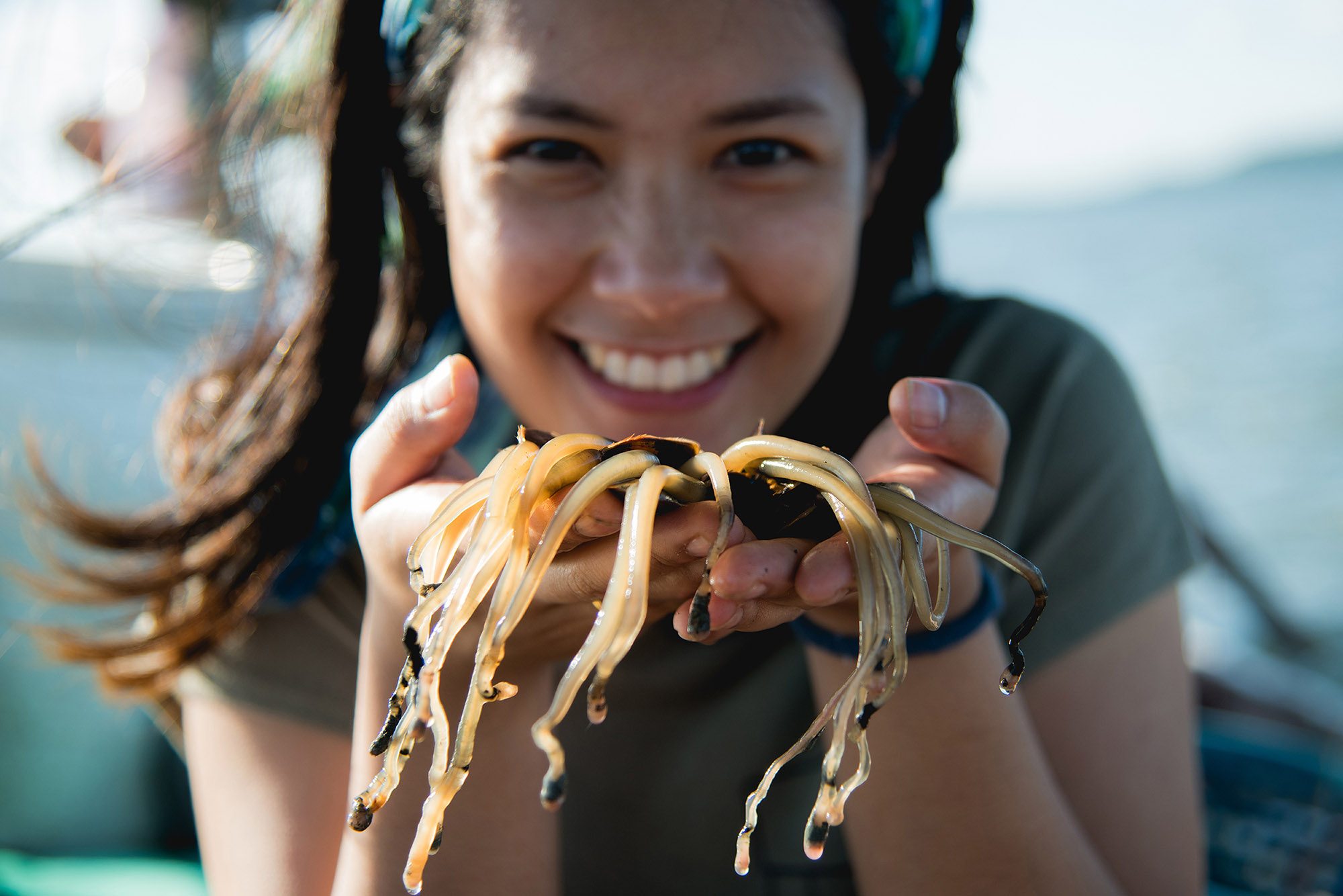 แกก็โผล่ขึ้นมาข้างเรือพร้อมกับหอยปากเป็ด หนึ่งกำมือ ^____^