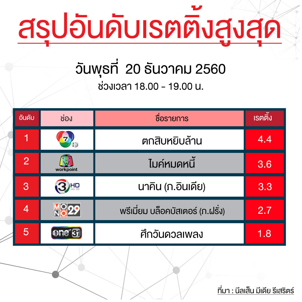 สรุปเรตติ้งสูงสุดประจำวันพุธที่ 20 ธ.ค. 60 ช่วงเวลา 18.00 - 19.00 น.