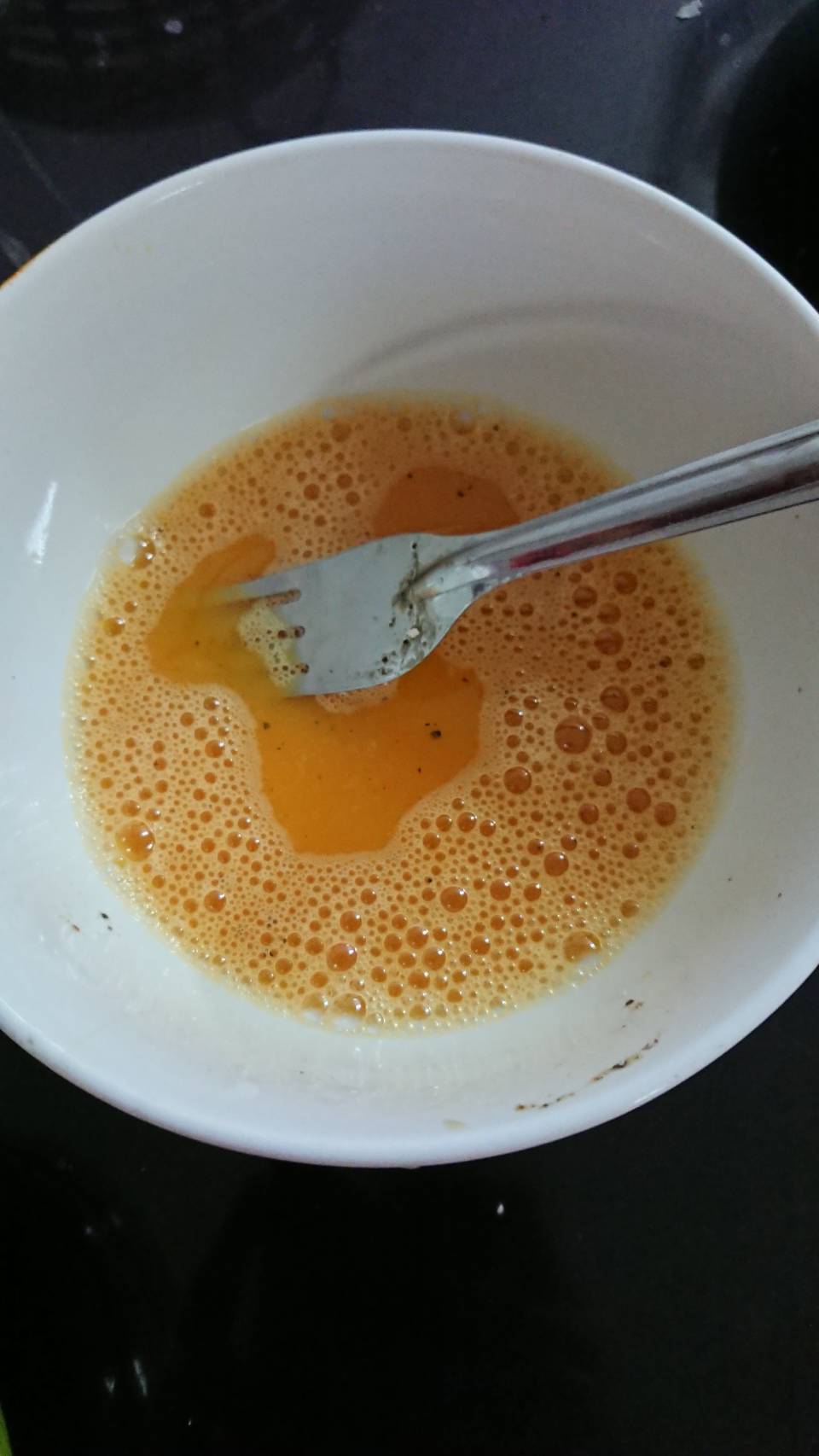 ปรุงไข่ด้วยน้ำปลากับพริกไทย อย่าใส่มาก จืดค่อยจิ้มซอส เค็มนี่แก้ไม่ได้เลยนะ ไข่ 2 ใบนะ ตีไข่แยกถ้วยไว้อีก 2 ใบ จะได้เอาไว้เทปั้นๆเวลาทอดให้เป็นลูกกลมๆ