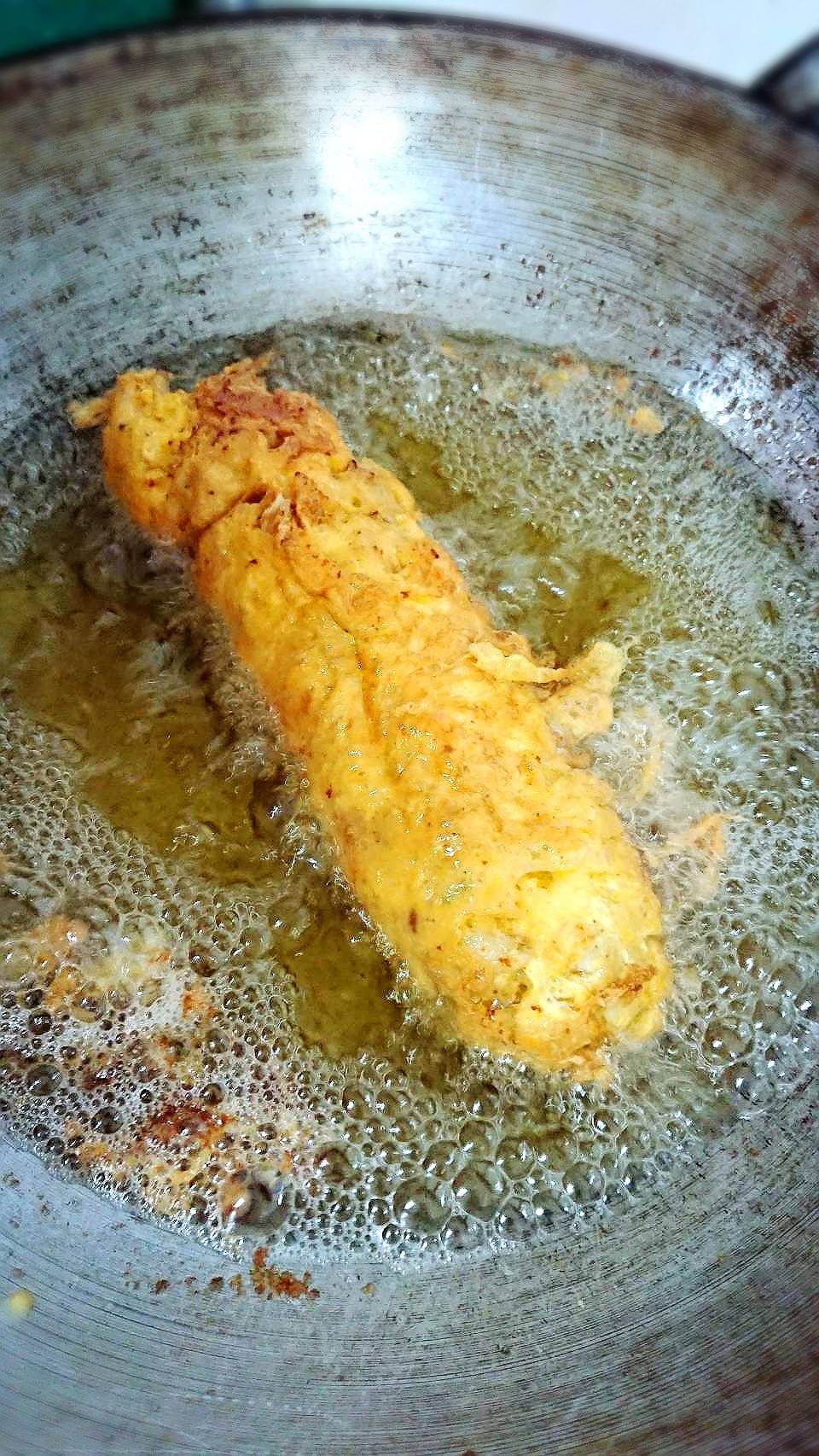 ใส่ไข่ลงไปในน้ำมัน อย่าให้ร้อนมาก เพราะจะทำให้ไข่ฟู ปั้นกลมไม่ได้ จากนั้นค่อยๆ กลับ ค่อยๆ เทใข่ทับ