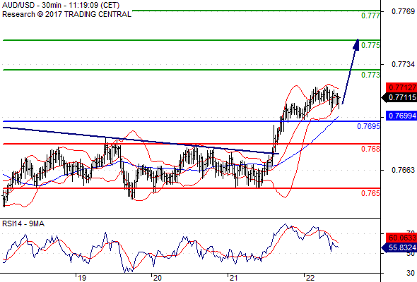 จุดที่ต้องการ: สถานะซื้อสูงกว่า 0.7695 เป้าหมายต่อไปที่ 0.7730 และ 0.7750