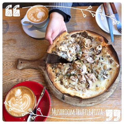 mushrooom &truffle pizza พิซซ่าถาดกลาง แบ่งประมาณ 8 ชิ้นพร้อมหน้าเห็ดทรัฟเฟิลกับกระเทียมที่รสชาติเข้ากันได้อย่างลงตัว ถือเป็นเมนูรอเมนูอย่าง chuck flap steak ได้ดีทีเดียว ราคา 1080 เยน