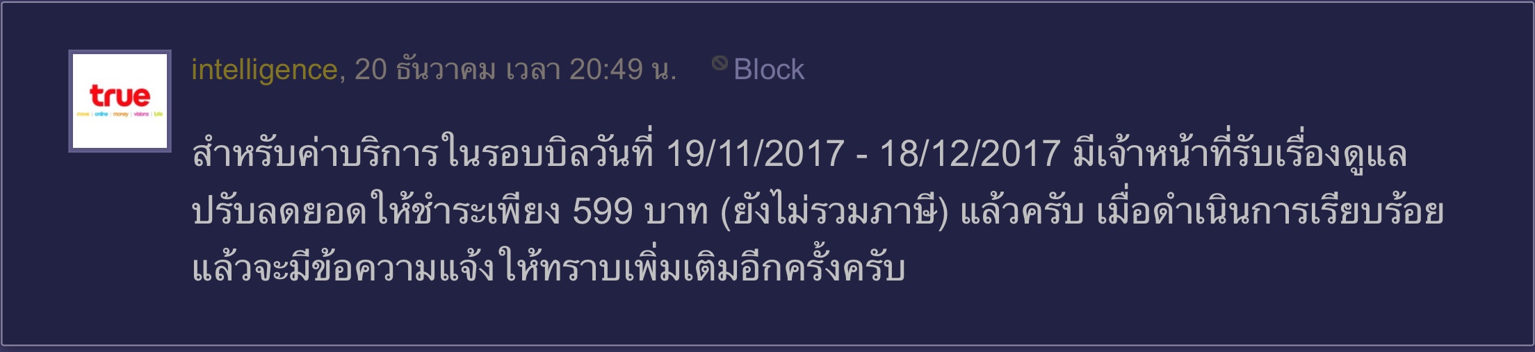 ข้อความที่ทางทรูแจ้งครับ ว่าจะเก็บรอบนี้เพียง 599 เนื่องจากเปลี่ยนเป็นโปรเดิมให้ไม่ทัน