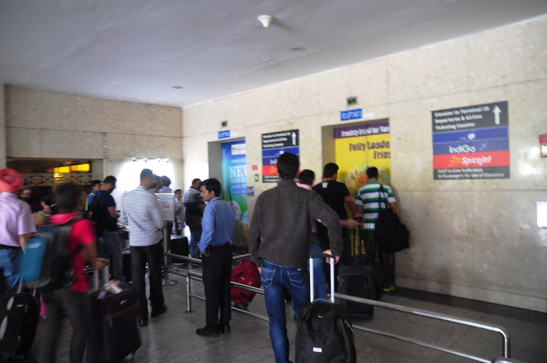 ออกมาก็จะเห็นป้ายที่จะไปสายการบินทั้ง 3 นี้ ต้องขึ้นลิฟต์ไปอีก เพราะอยู่ชั้นบน โดยลิฟต์มีอยู่ 2 ตัว คนก็จะเยอะหน่อย พอขึ้นไปต้องตรวจกระเป๋าก่อนเข้าอีก รอคิวต่อไป