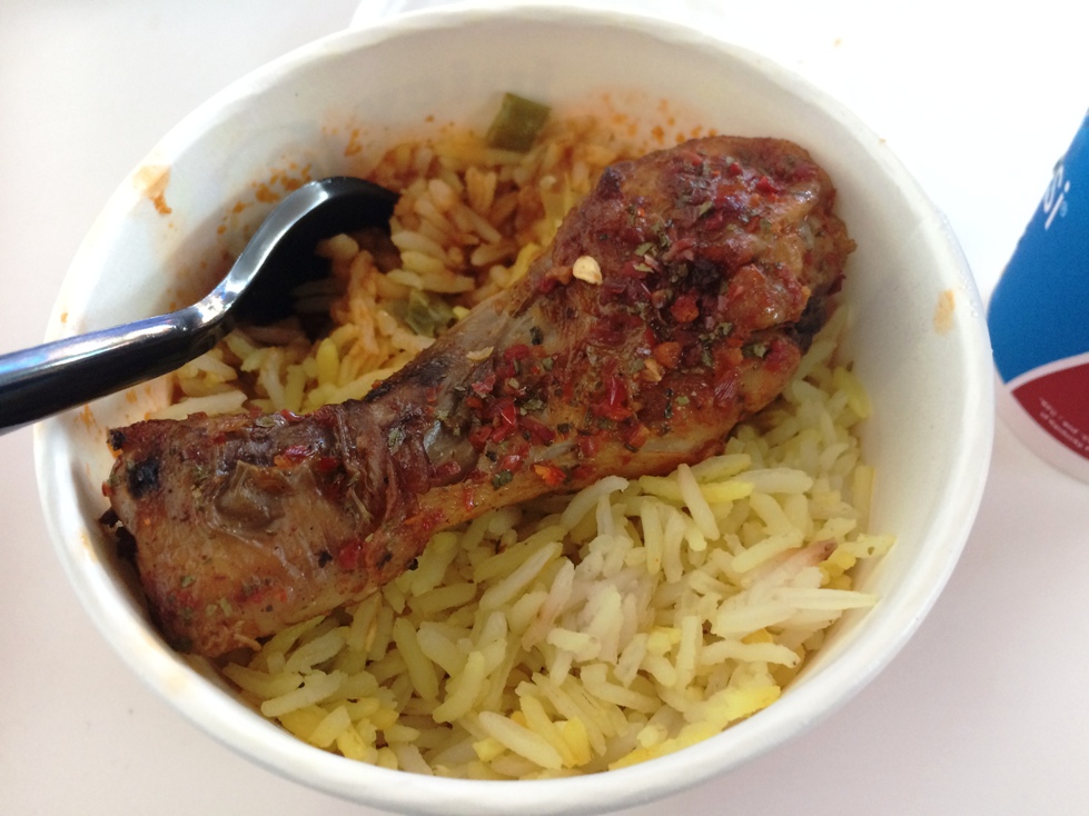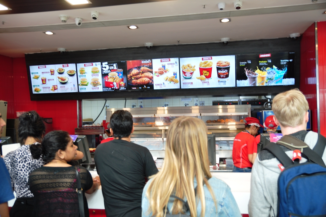ที่นี่จะมีร้านค้าขายของ ร้านอาหารข้างใน แต่ที่นั่งรอต้องนั่งรอด้านนอก เพราะจะมีประตูกั้นอีกทีนึง ต้องรอให้ใกล้ๆ เวลาของเที่ยวบินตัวเอง ถึงจะใช้ Boarding pass ผ่านเข้าไปได้ สงสัยเพราะที่นั่งแต่ละสายการบินก็ใช้รวมกันอีก ที่นั่งเลยไม่พอ ไม่เหมือนสนามบินทั่วไปที่จะมีพื้นที่นั่งแยกแต่ละ gate ให้เลย ไม่รู้จะกินอะไรระหว่างรอ เลยจัด KFC ที่สนามบิน ข้าวน่องไก่ รสชาติไม่เลวเลยสำหรับมื้อแรก