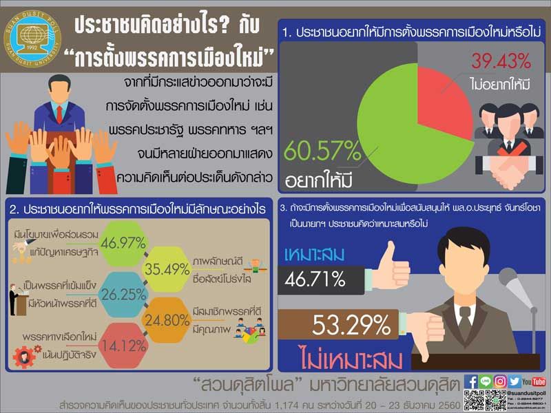 วันนี้ (24 ธ.ค.) “สวนดุสิตโพล” มหาวิทยาลัยสวนดุสิต ได้สำรวจความคิดเห็นของประชาชนทั่วประเทศ เรื่องประชาชนคิดอย่างไร? กับ “การตั้งพรรคการเมืองใหม่” โดยจากที่มีกระแสข่าวออกมาว่าจะมีการจัดตั้งพรรคการเมืองใหม่ เช่น พรรคประชารัฐ พรรคทหาร จนมีหลายฝ่ายออกมาแสดงความคิดเห็นต่อประเด็นดังกล่าว เพื่อสะท้อนความคิดเห็นของประชาชนที่สนใจติดตามข่าวการเมือง ซึ่งจากผลสำรวจจำนวนทั้งสิ้น 1,174 คน ระหว่างวันที่ 20 - 23 ธันวาคม 2560 สรุปผลได้ ดังนี้