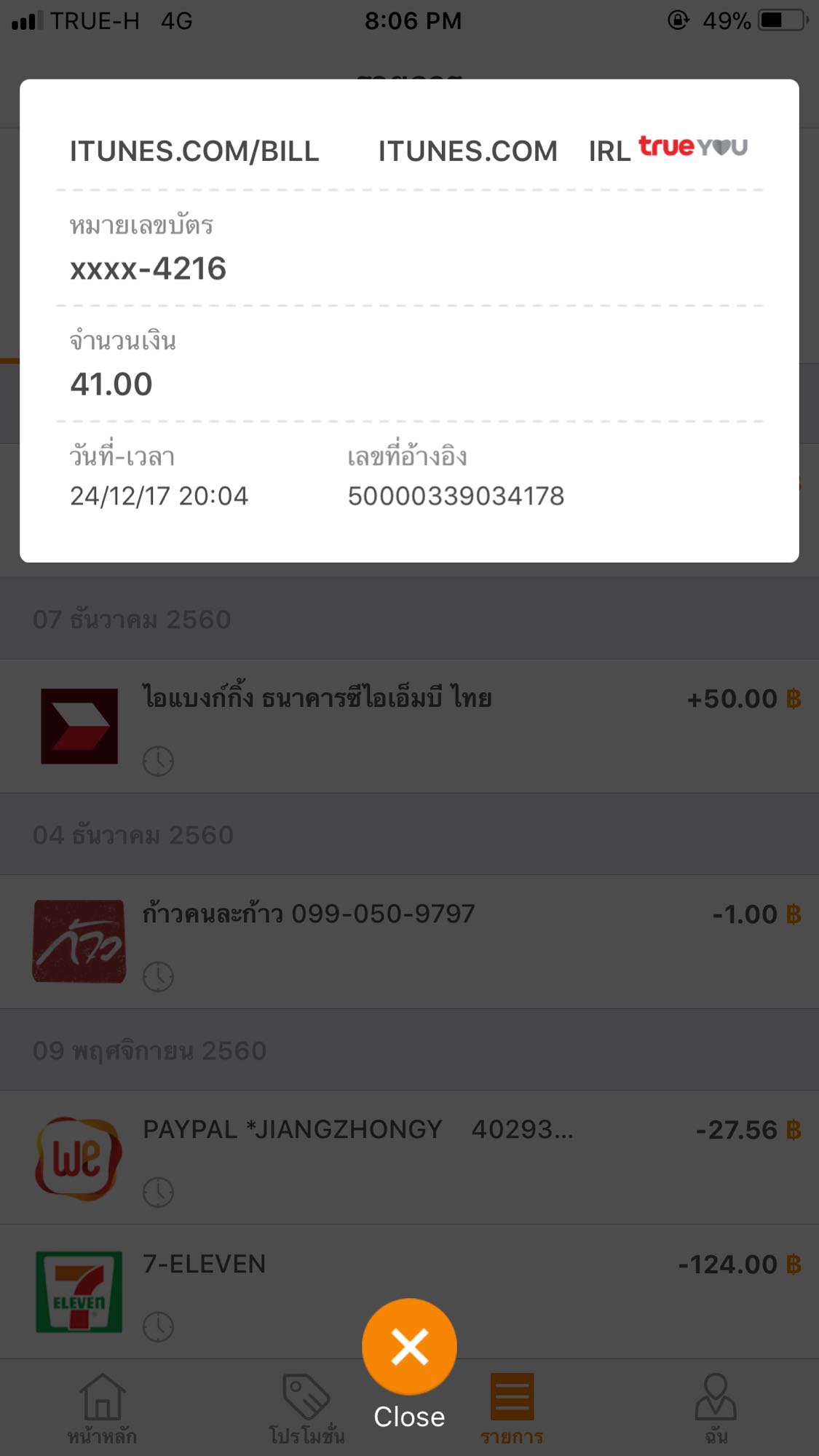 โดนหักเงินตอนยืนยันเลขบัตร trueyou card ใน apple store ไป 41 บาท ไม่แน่ใจว่าค่าอะไร ยอดเงินไม่คืน