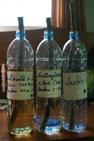 ปักชำมะม่วงด้วยอด เป็นเร็ว ได้ต้นเตี้ย 1.เริ่มขั้นตอนแรกด้วยการเลือกยอดมะม่วงที่สมบูรณ์แล้วตัดกิ่งออกให้หมด 2.จากนั้นให้นำน้ำสะอาดเทใส่ขวดแล้วเติมปุ๋ยน้ำAB เพื่อเพิ่มแร่ธาตุ