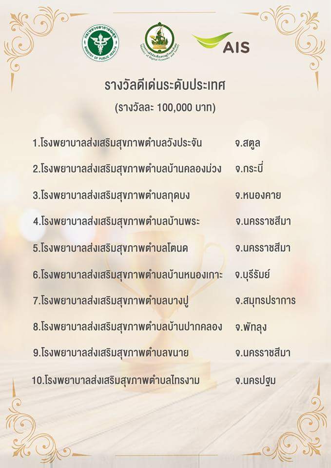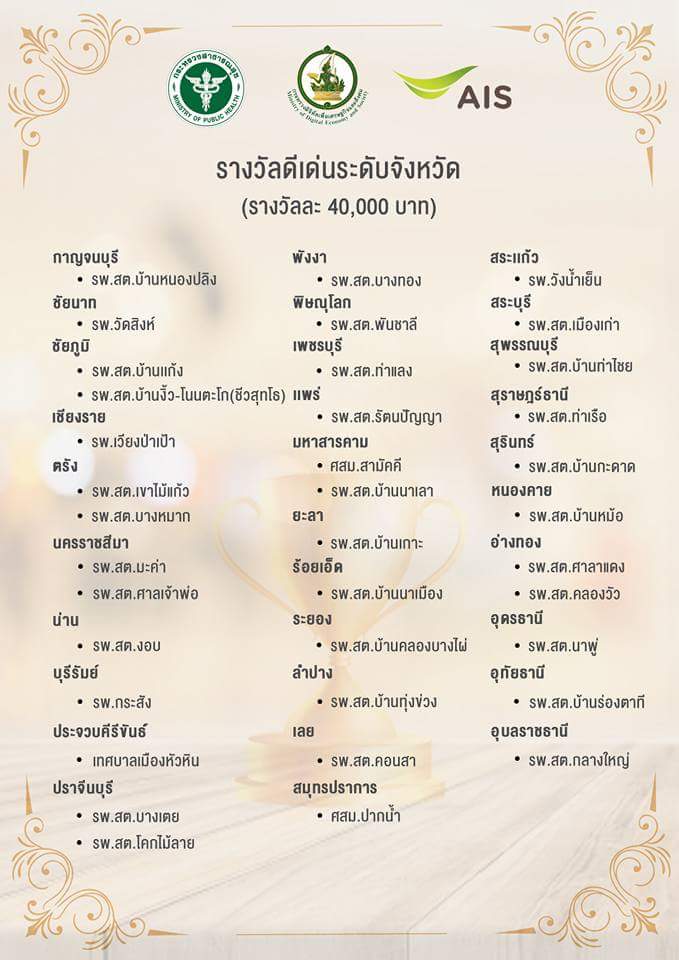 ขณะที่หน่วยบริการสุขภาพระดับปฐมภูมิ, รพ.สต. และชมรมอสม.ที่ผ่านเกณฑ์การพิจารณาคัดเลือกได้รับรางวัลดีเด่นระดับจังหวัด จำนวน 37 รางวัล* ได้รับเงินรางวัลๆละ 40,000 บาท