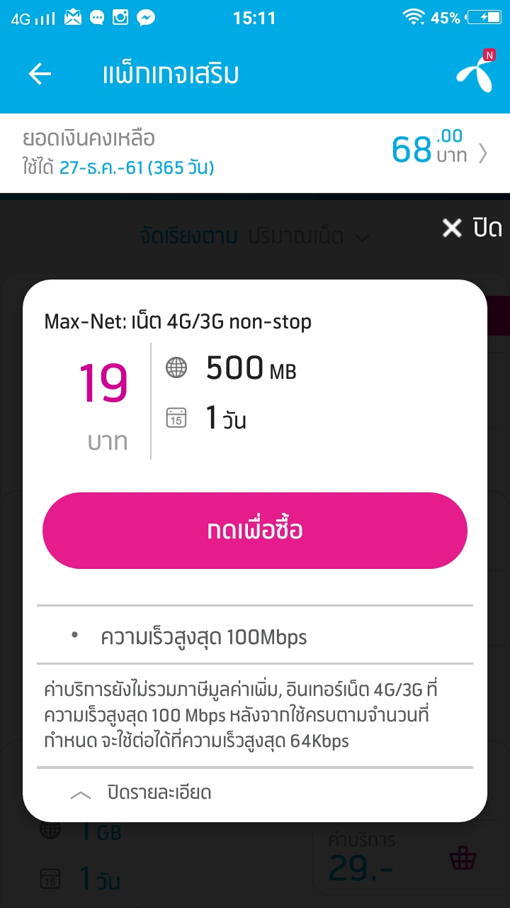 มีเงิน 68 บาท กดซื้อเน็ตถูกสุด 1 วัน (ราคาไม่รวมภาษีมูลค่าเพิ่มคือ 19 บาท) เหลือ 28 บาท