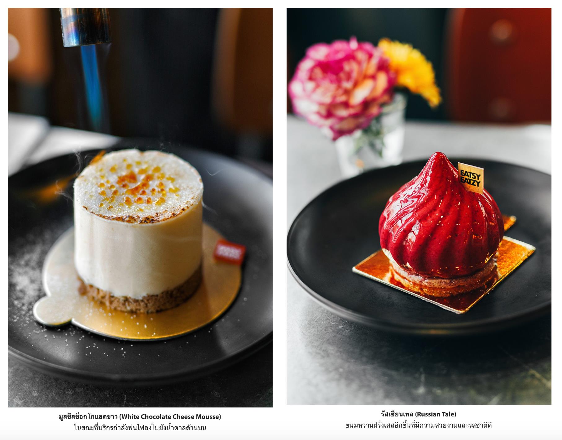 แต่ถ้าหากว่าคุณได้สั่งมูสชีสช็อกโกแลตขาว (White Chocolate Cheese Mousse) ก็ขอให้เตรียมพบกับโชว์ที่เพลินเพลินจากบริกรที่จะใช้ทอร์ช (Torch – อุปกรณ์ใช้พ่นไฟอย่างที่ใช้ทำแคร็มบรูเล่ [Crème Brûlée]) หลอมละลายน้ำตาลด้านบนขนมให้เป็นคาราเมลกลิ่นยั่วยวนถึงที่โต๊ะ ความเค็มอ่อนของชีสผสานเข้ากับความหวานที่ไม่มากของเนื้อสัมผัสมูสช็อกโกแลตขาวพร้อมด้วยไส้ของบลูเบอร์รี่น่าประทับใจจะกลายเป็นขนมที่ทำให้คุณลืมไม่ลงเลยทีเดียว