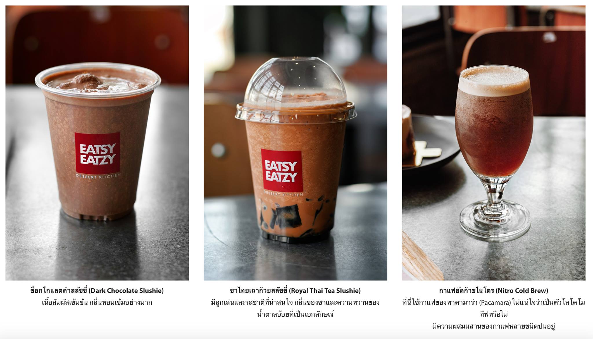 หรือว่าจะเป็นเครื่องดื่มเกล็ดหิมะในแบบความเข้มข้นของช็อกโกแลตดำสลัชชี่ที่ทำให้การเริ่มต้นชีวิตของวันเปี่ยมไปด้วยพลังและความทะเยอทะยาน หรือกลิ่นหอมเข้มดั้งเดิมด้วยน้ำตาลอ้อยกับชาและเฉาก๊วยที่ไม่ตามใครว่าจะต้องเป็นไข่มุกอยู่เสมอ อีทซี่อีทซี่ก็มีหนทางของตัวเองได้อย่างน่าชื่นชมอยู่ไม่น้อย