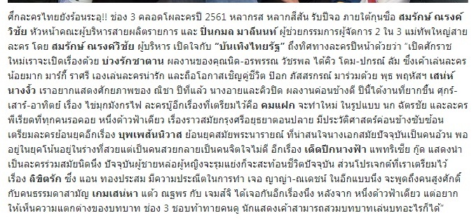 ช่อง 3 เปิดกรุละครรสแซ่บปี 2561 ยืนหยัดสโลแกน ‘สร้างสรรค์อย่างมีคุณภาพ’