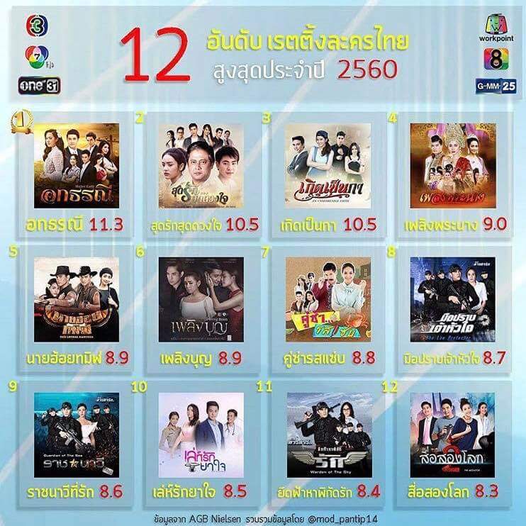 12 อันดับ เรตติ้งละครสูงสุดปี 60