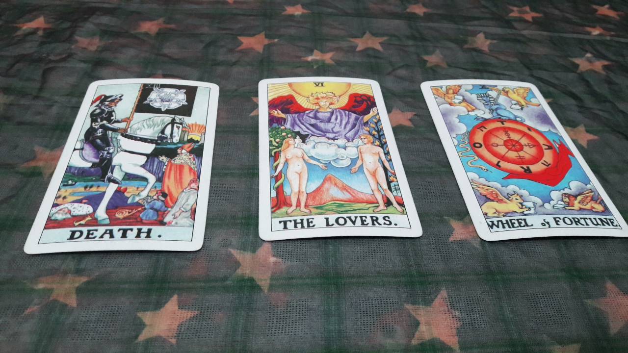 เราถามว่า แฟนเก่าจะกลับมาคบกับเราไหม เปิดไพ่แล้วได้ the star, the high priestess และ strength ค่ะ เราถามต่อว่า ตอนนี้แฟนเก่าคบคนใหม่ไปแล้วหรือยัง แล้วเปิดไพ่ได้ justice, queen of pentacles และ queen