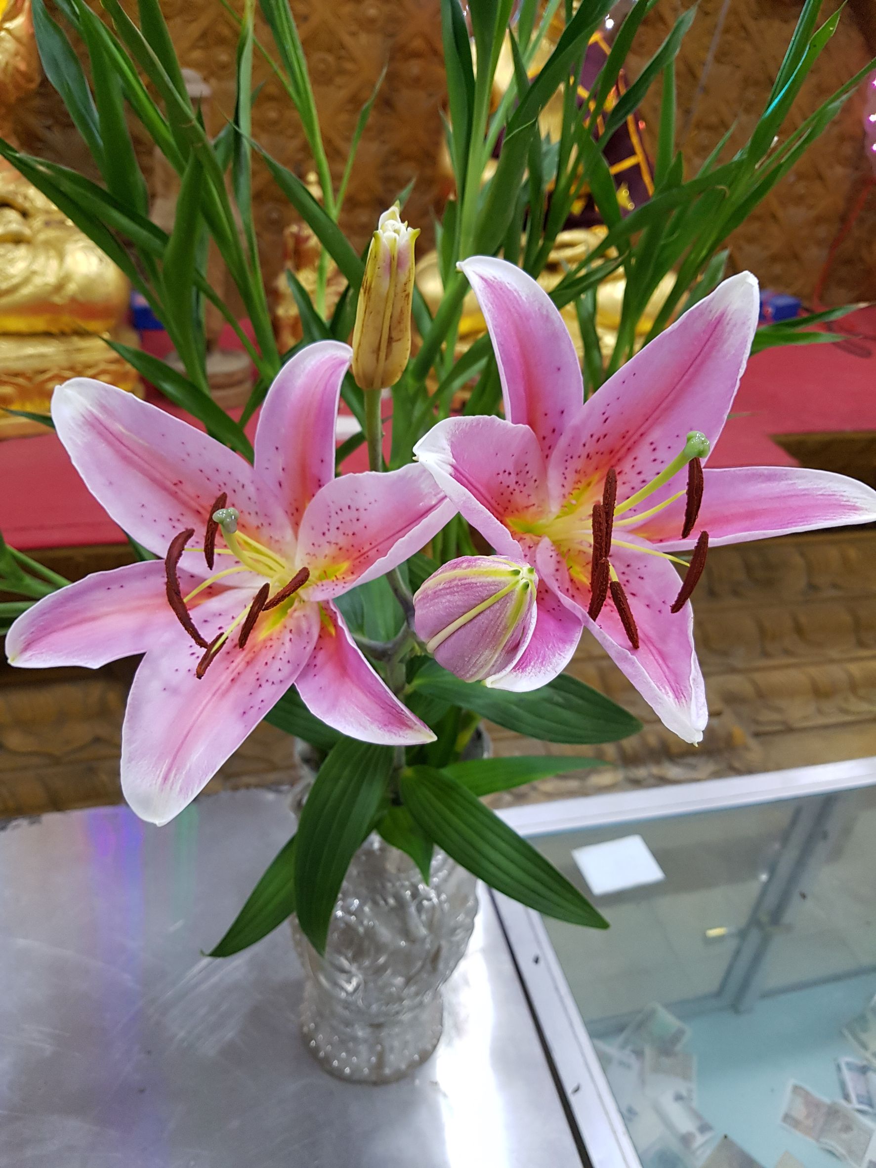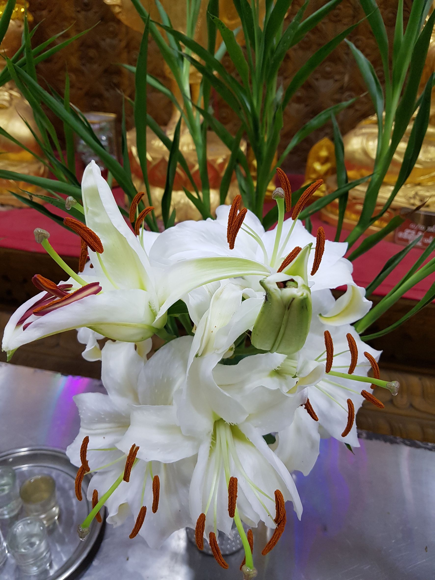 ดอกไม้สีสวยบูชาในบริเวณวัดพระนอน
