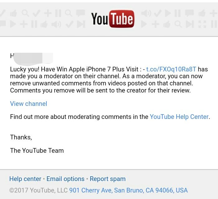 มีemail ส่งมาว่าเราถูกตั้งเป็น moderator ช่องนึงในYouTube ที่เราไม่เกี่ยวข้อง