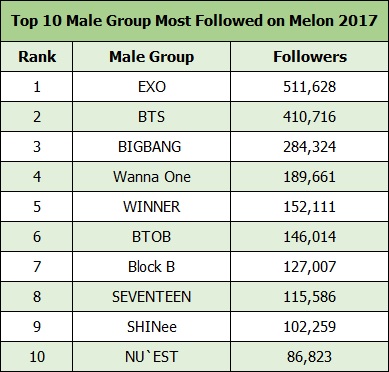 Top 10 บอยกรุ๊ปที่มีจำนวนผู้ติดตามบนเมล่อนมากที่สุด 2017