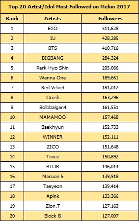 Top 10 ศิลปิน/ไอดอลที่มีจำนวนผู้ติดตามบนเมล่อนมากที่สุด 2017
