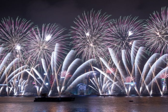 Fireworks explode over Victoria harbour during New Year celebrations in Hong Kong on January 1, 2018. / AFP