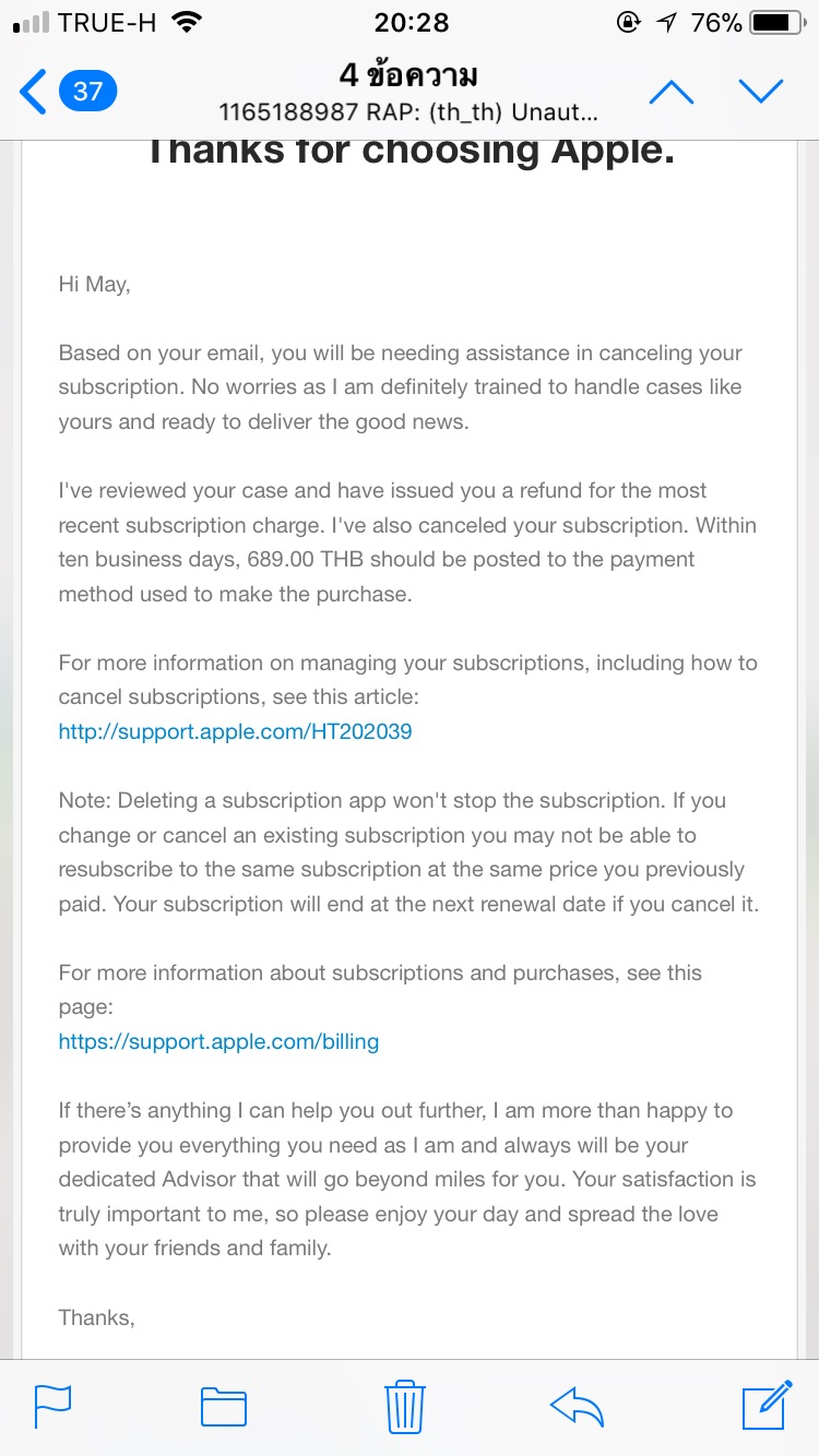 โดยความตกใจ อราจึงรีบยกเลิก แต่เงินก็ได้ถูกตัดไปแล้ว จึงได้ ส่ง report ขอความช่วยเหลือปละได้รับอีเมล ตอบกลับ ดังนี้