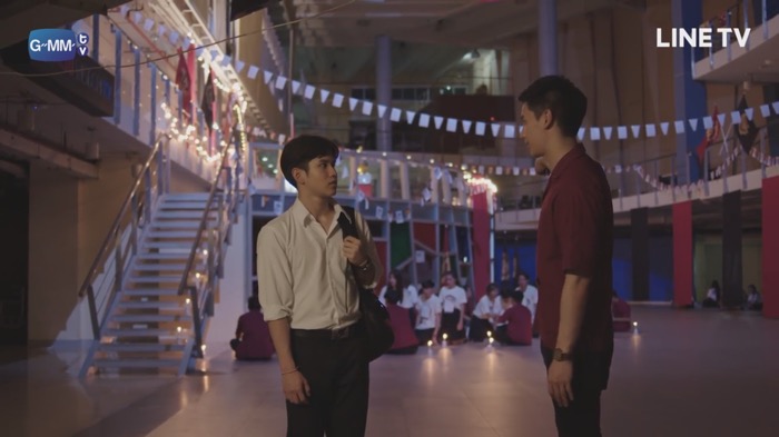 และฉากนี้กับรูปนี้ ซีนนี้ดาเมจชั่งรุนแรง รุนแรงเหลือเกิน เกินใจของคนจะทนน(เครดิต: รุนแรงเหลือเกิน ไมโคร) ฉากที่แสดงชัดเจนถึงการเปิดใจให้ของเดย์ แววตาที่อ่อนลง ถ้าเทียบกับครั้งแรกที่เจอกัน มีแต่ความอคติ แข็งกระด้าง ภาพนี้ กับยิ้มน้อยๆ หลังจากที่ทิวชวนเดย์ให้เข้าไปร่วมกิจกรรมฝูกสายสิญจน์กับเพื่อน เดย์ยกแขนข้างขวาที่ทิวฝูกสายสิญจน์ให้ขึ้นมาแล้วพูดว่า “แค่นี้ผมก็พอแล้ว” อื้มมมจร้าาาา ตายอย่างสงบศพสีชมพูอ่อน คือประเด็กที่กรี้ดขนาดนี้คือก่อนหน้าที่นางจะพูด มีรุ่นพี่ผู้หญิงสองคนเดินเข้ามาหาเดย์แล้วผูกสายสิญจน์ให้ที่ข้อมือด้านซ้าย แต่ดูนางจะไม่ได้เมนชั่นถึงสายสิญจน์สองเส้นนั้นแต่อย่างใด เลือกที่จะยกแขนข้างขวาที่ทิวผูกให้ขึ้นมาพูด และหลังจากที่ทิวบอกว่า งั้นขอตัวกลับเข้าไปก่อน นางก็ตอบกลับโดยการยิ้มน้อยๆกับ “ครับ” เป็นครับที่นุ่มนวลที่สุดเท่าที่นางเคยใช้พูดกับทิว นี่เรียกซีนได้รึเปล่าาา หรือเราจิ้นไปเอ๊งงง🙄😂