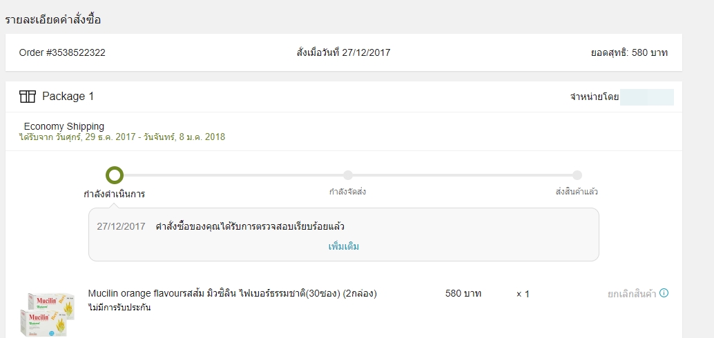 แต่ครั้งนี้ เราสั่งของก่อนปีใหม่ ซึ่งเราโอเคถ้ามันจะได้ช้า เราก็คอยเช็คสถานะตอลดว่าเป็นยังไงบ้าง แต่ครั้งนี้สถานะคือ กำลังดำเนินการ มาตลอด เราก็คิดว่าคงติดปีใหม่ แต่อยู่เฉยๆวันนี้ก็มีโทรศัพท์จากไปรษณีมาบอกว่ามีพัสดุเก็บเงินปลายทางมา ให้ไปรับ เป็นเงิน 580 บาท เราก็สงสัย เลยเช็คสถานะว่าของถึงแล้วหรอ แต่ปรากฎว่าสถานะก็ยังเหมือนเดิม คือ กำลังดำเนินการ