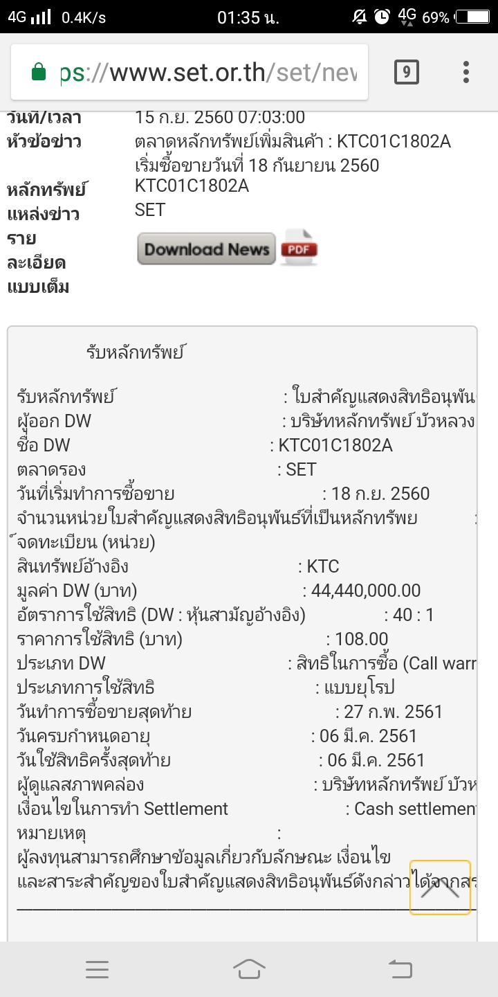 คือราคา warant ของ KTC01C1802A ปัจจุบันอยู่ที่ 1.85 บาท