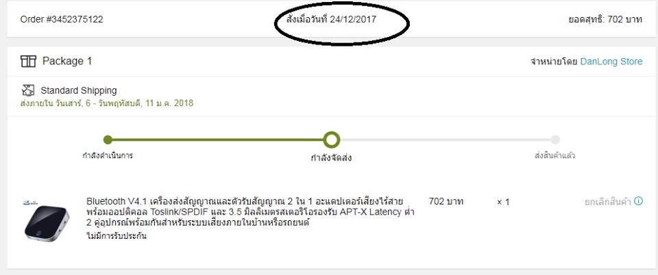 เรื่องมีอยู่ว่า ดูสินค้าไว้ 1 ตัว ก็วันที่ 27 บอกหน้า web จะส่งของวันที่ 28 - 30 ธ.ค. 60 ก็โอเคนะ เทียบกับ web ต่างประเทศที่เคยสั่งเองต้องใช้เวลาประมาณ 12-15 วัน อันนี้เห็นส่งก่อนปีใหม่ ถึงจะแพงกว่า eBay หรือ Aliexpress แต่ก็โอเค