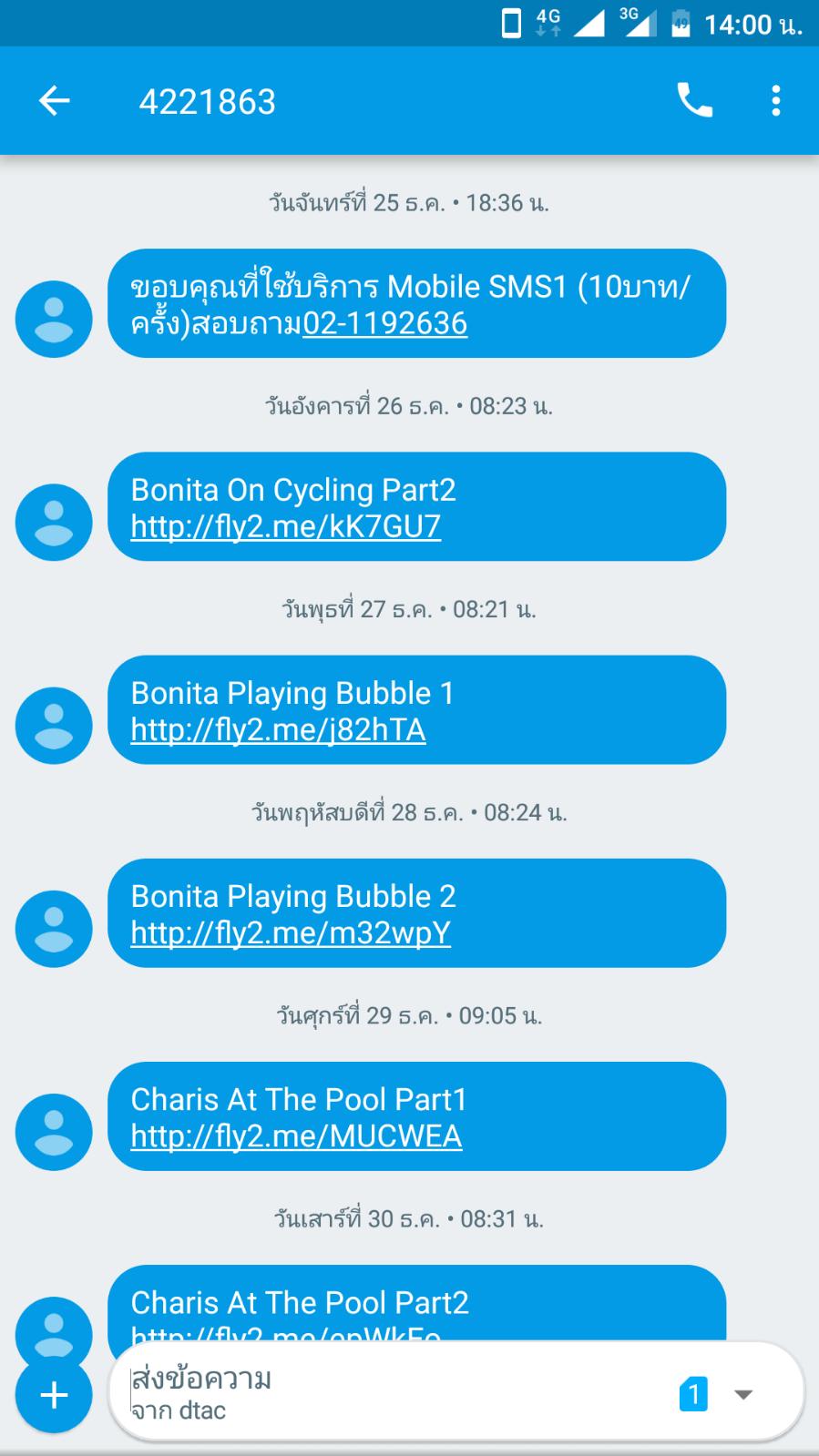 เพิ่งมาสังเกตุตอนจะชำระค่าบริการ เพราะปกติไม่ค่อยสนใจเรื่อง sms แปลกๆ เข้ามาอยู่แล้ว ก็ว่าอยู่ทำไมส่งมาทุกวันวันละ สามสี่ฉบับ พอเจอบิลโดนไป 200 กว่าบาทภายใน 4 วัน ส่งมาทุกวันทั้งๆที่ไม่เคยได้สมัคร