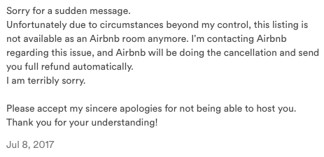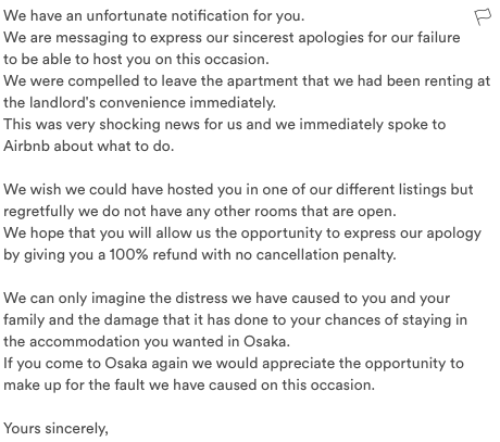 ตอนแรกจองของที่โอซาก้าไปก็ไม่มีปัญหาอะไรค่ะ จ่ายเงินไปเต็มจำนวนหมดแล้วคุยกับโฮสเรียบร้อยแล้วด้วย "แต่" หลังจากนั้นประมาณ 4 วัน อยู่ๆ โฮสก็มายกเลิกการจองแบบดื้อๆ เลย พร้อมส่งข้อความมาบอกตามนี้ค่ะ