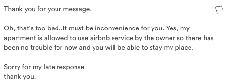 และเราก็ต้องหาใหม่อีกเช่นเคยค่ะ มาลงตัวกับโฮสคนนี้ซึ่งตรงหน้าที่จอง รีวิวก็ดูเป็นด้านบวกหมดเลยก็เลยเอาที่นี่แหละ ตอนแรกคุยเราก็เน้นถามไปว่าจะไม่มีปัญหาเรื่องกฎหมายอะไรใช่มั้ย โฮสก็บอกประมาณว่าไม่มี สบายใจได้เลย ก็โอเคแฮปปี้แต่สำหรับโฮสคนนี้คือไม่โดนยกเลิกแต่เจอประสบการณ์ที่แย่มากค่ะ