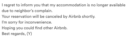 เราจองไปทีแรกก็โดน "ยกเลิก" เหมือนกันค่ะ แต่สำหรับโฮสคนนี้น่าจะมีปัญหากับเพื่อนบ้านและเจ้าของอพาร์ทเมนท์เนื่องจากคนที่มาเช่าห้องผ่านทาง Airbnb สร้างความรบกวนให้กับเพื่อนบ้าน