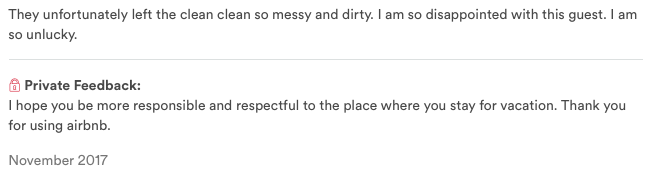 เราเห็นครั้งแรกแล้วโมโหมากค่ะ ทั้งๆ ที่ไม่ได้ทำอะไรสกปรกเลยยยยยยยยย จะ Respond อะไรก็ไม่ได้เลยค่ะ เนื่องจาก Airbnb มีนโยบายว่าถ้าจะ Respond รีวิวอันนี้คือจะต้องทำภายใน 14 วันเท่านั้น ซึ่งเราก็ได้ติดต่อทาง Airbnb ไปทางทวิตเตอร์ (เราแนะนำใครมีปัญหาอะไรเกี่ยวกับ Airbnb แล้วต้องการจะติดต่อกับทาง Airbnb โดยตรงแนะนำให้ติดต่อทางทวิตเตอร์ค่ะ ตอบเร็วมากๆ มีคนสแตนบายรอตอบอยู่ 24 ชั่วโมงเลย) ซึ่งก็ได้ความมาตามนี้ค่ะ