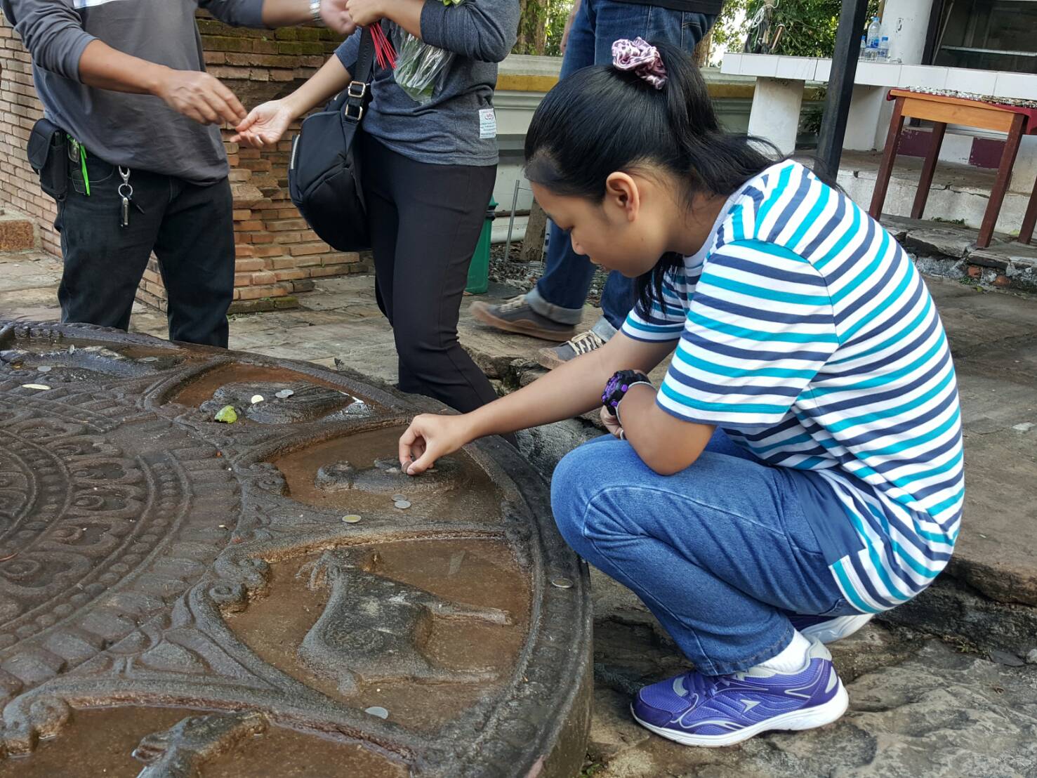 พอเดินขึ้นบันไดไปอีกหน่อย มีฐานทางกลมสูงจากพื้นขึ้นมาไม่ถึงหัวเข่า เป็นรูปนักษัตริย์ 12 ราศี อ๋อ.. เขาให้เอาเหรียญมาวางตั้งที่รูปสัตว์ปีเกิดของตัวเอง งานนี้ไม่เคยทำได้ ให้ลูกทำให้ก็แล้วกัน ลูกตั้งเหรียญได้เหมือนเคย อิอิ... (แอบชมลูกตัวเอง)